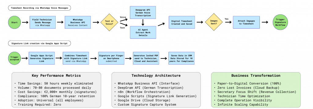 The automation system works through a simple WhatsApp interface, allowing construction workers to send voice messages detailing their work. AI analyzes these recordings, generates digital timesheets, collects electronic signatures, and automatically archives everything in cloud storage. By requiring only a WhatsApp message instead of paper forms, the solution achieves universal adoption among non-tech-savvy field workers while meeting Germany’s strict 10-year documentation retention requirements.